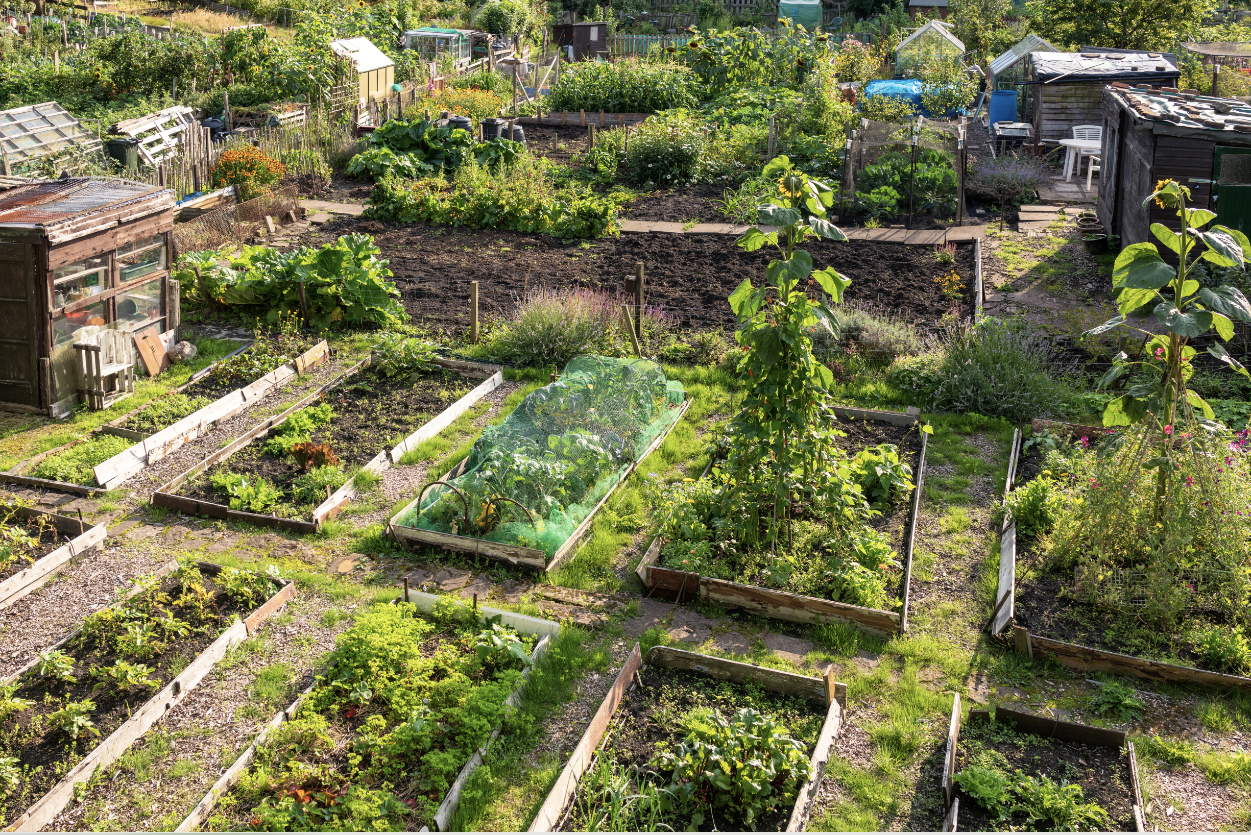 A vibrant community garden thriving in full bloom, showcasing lush greenery and colourful blossoms. This space reflects a balance between nature and urban life, inviting neighbours to connect, cultivate, and celebrate sustainability together.
